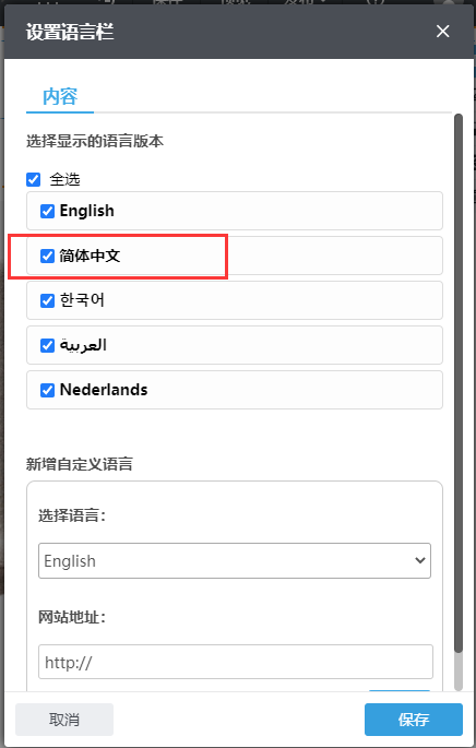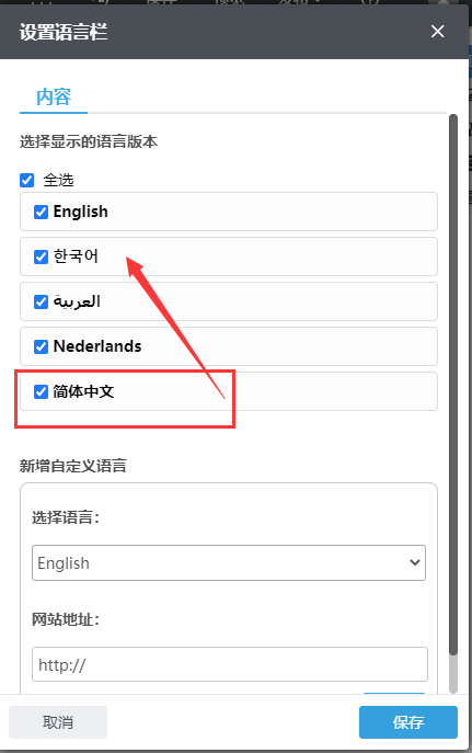2、对于多语言的网站,有的用户希望语言栏中的语言可以按照一定顺序展示出来,那么怎么操作可以实现对语言栏的排序呢?操作步骤如下:
