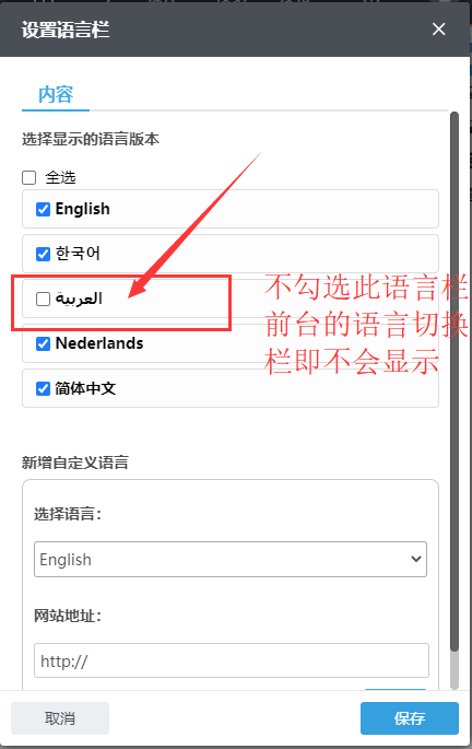 第3步:点击编辑或设置,会弹出这个组件的的设置话框,会发现网站所有开通的语言都是打上√的。那么对于不想要在前台显示的语言,我们只要把√去掉就可以。