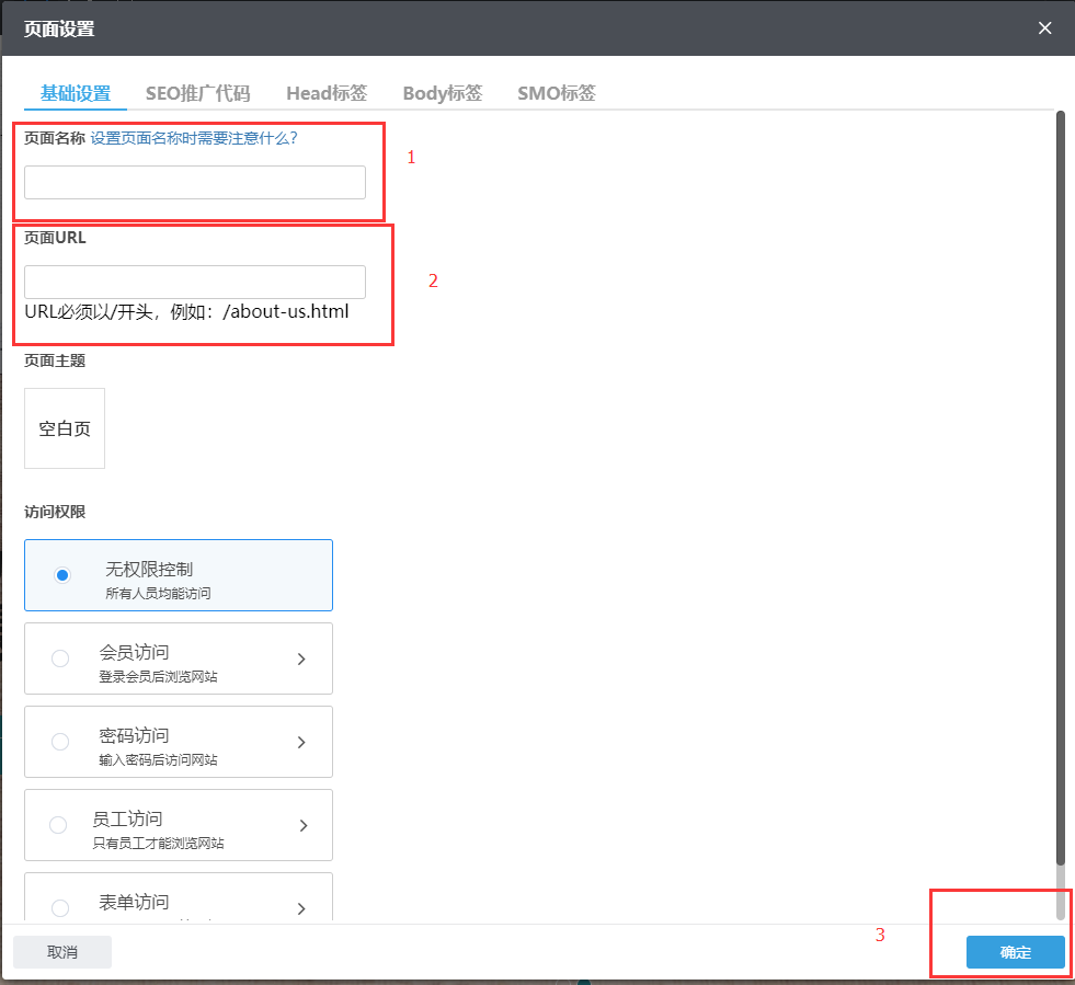 第三步:弹出“页面设置”窗口,输入页面标题、新建页面URL会自动生成,也可以手动修改,每个页面还可以单独设置访问权限,然后单击“确定”按钮;