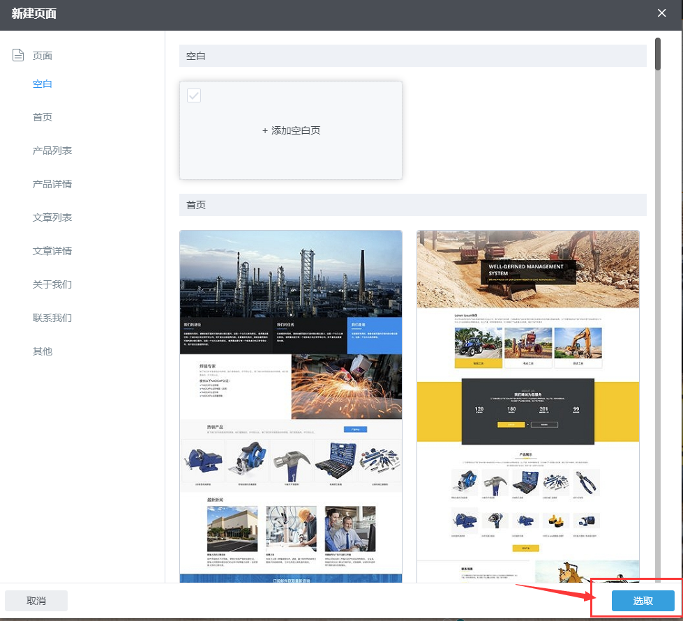 第二步:弹出“新建页面”窗口,可以选择空白页面或者根据需求选择已排版好的页面主题,然后点击“选取”按钮;