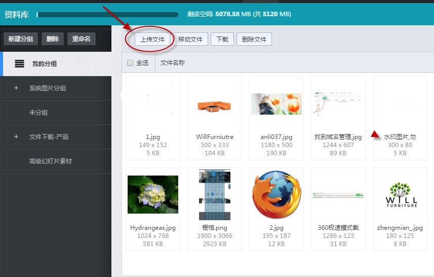 第二步:为上传的文档分组,方便页面上应用此文档时查找。单击“新建分组”输入组名;