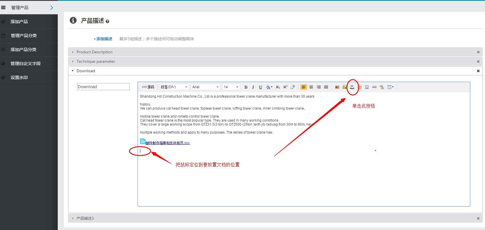 2、在产品编辑页面,上传此文档。如下图所示,鼠标定位到要添加的位置,然后单击“文件下载”按钮上传此文件。