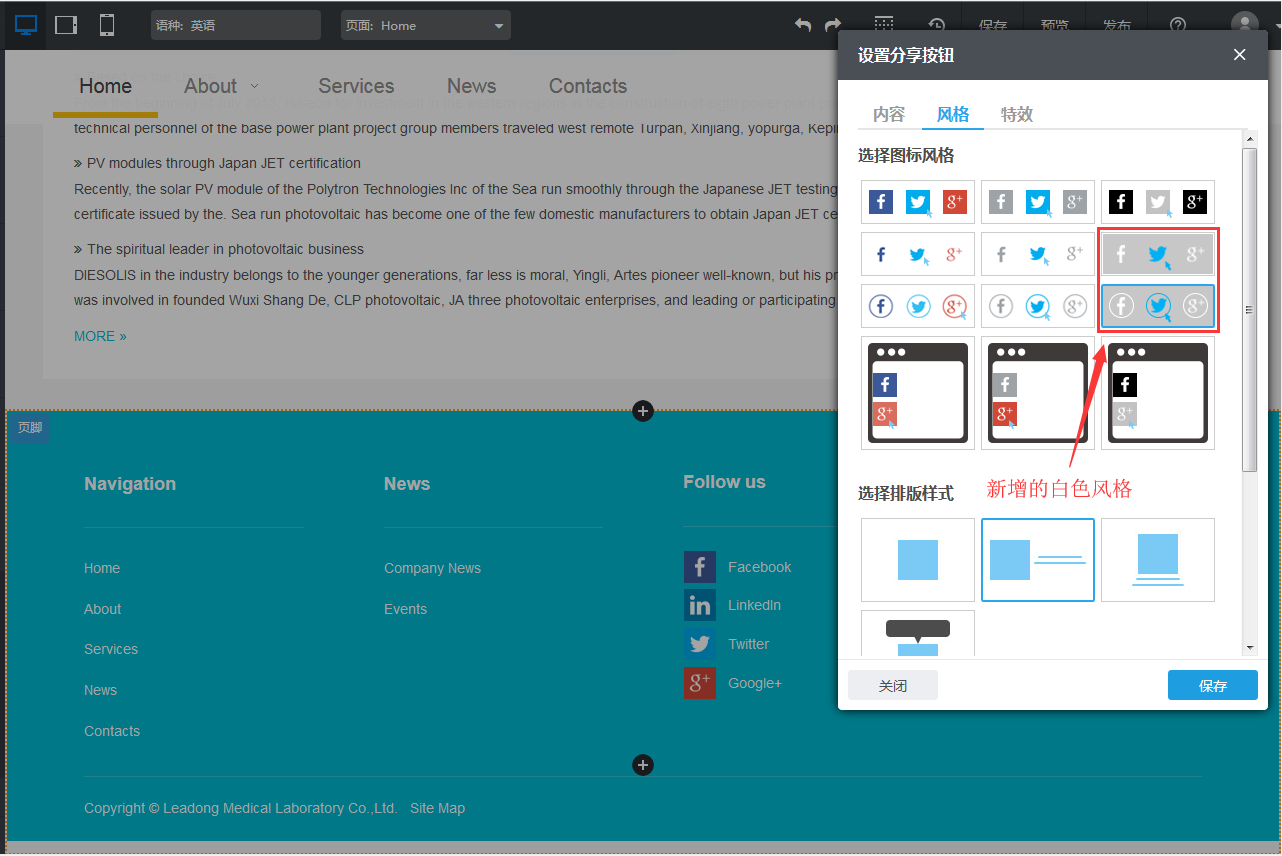 【操作方式】登陆进入支点-》编辑网站-》分享组件/社交关注组件设置-》风格-》选择新增的白色风格。