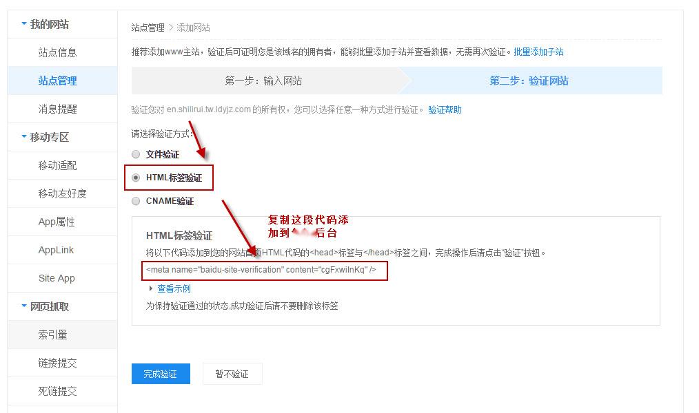 4、输入网站后需要验证网站归您所有,请勾选”HTML标签验证“按钮,然后复制生成的代码,添加到支点后台;