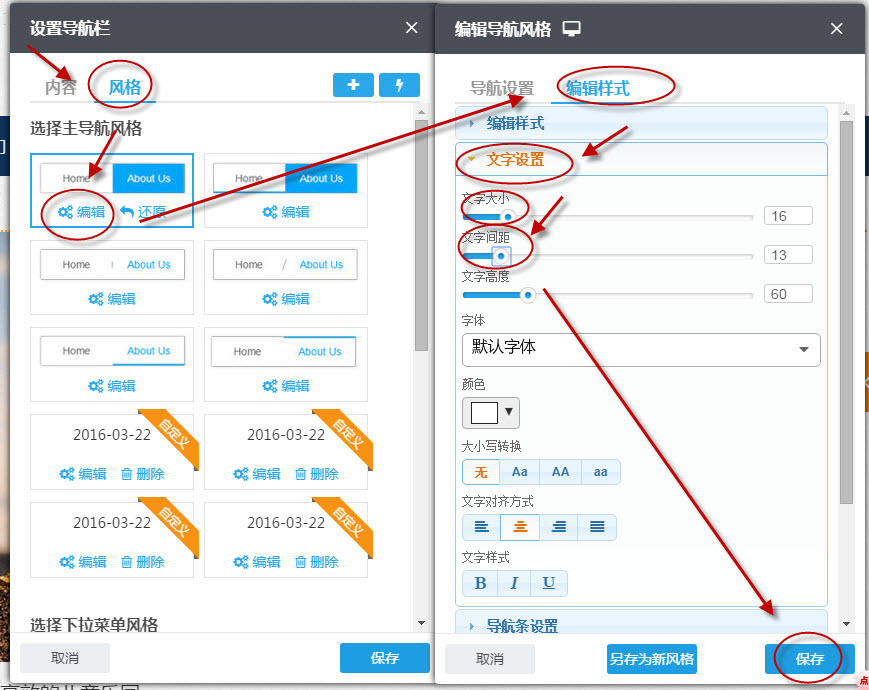3、调小文字间距、文字字号。找到高级导航组件,单击设置--风格--编辑--编辑样式--文字设置--文字间距,调小文字间距。若这里设置了内外边距,可以尝试调小文字间距,然后保存。