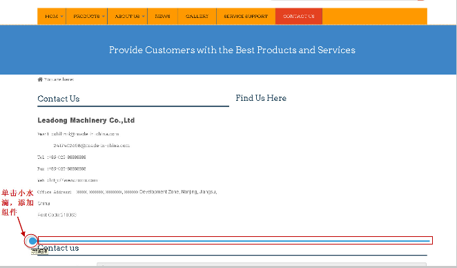先切换到需要添加在线表单的页面,把鼠标放到需要放在线表单的位置出现小水滴按钮及右侧一条蓝色的线,蓝色线所在位置即代表表单的位置。