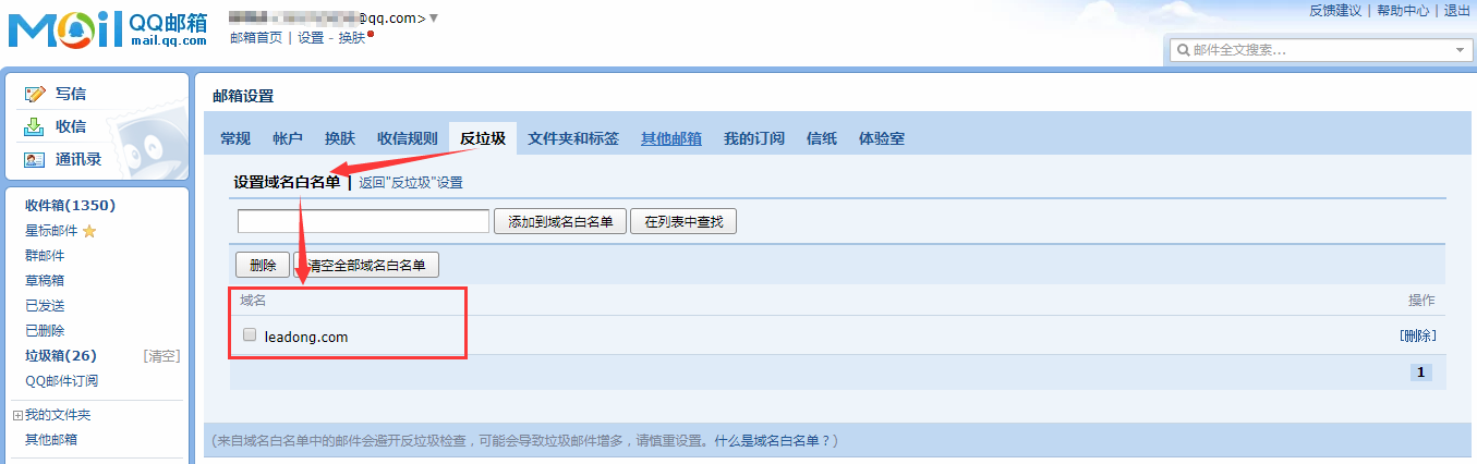 第一步:请把支点的邮件域名添加到邮箱的白名单中。这里以QQ邮箱为例,在邮箱设置->反垃圾->设置域名白名单页面,添加sdzhidian.com到白名单即可,如下截图所示。如果自己的邮箱不会操作的话,请咨询邮箱提供商。