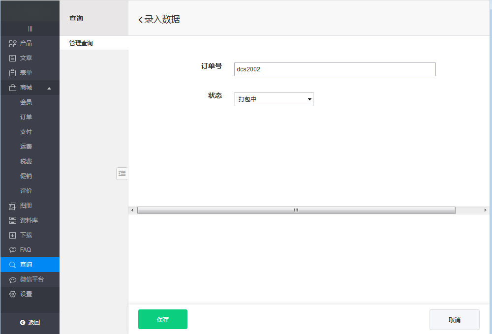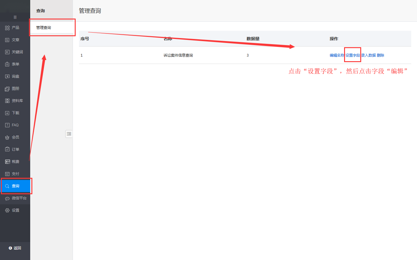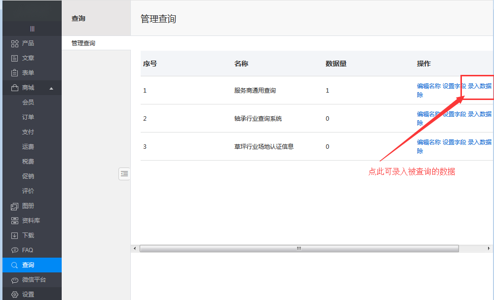 5.字段设置好了后,在录入数据中录入可以被客户查询的数据内容;