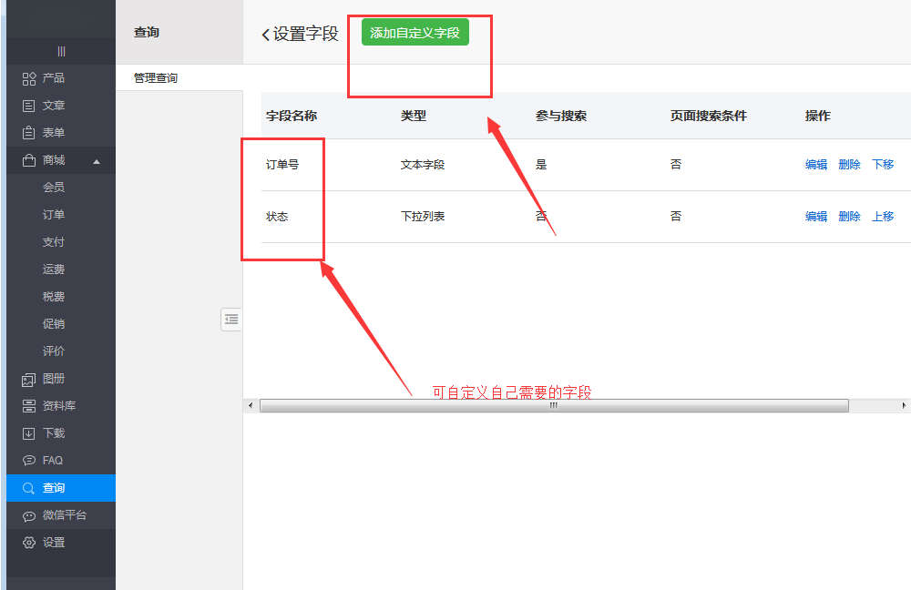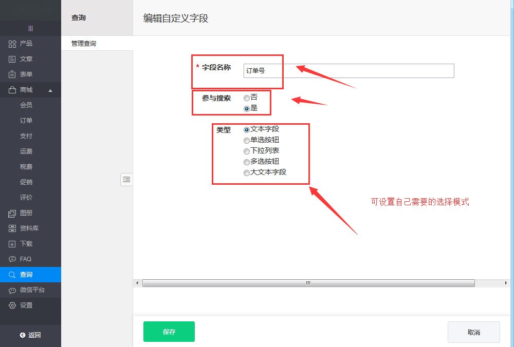 4.每个自定义字段里可以设置是否参与搜索,或者其他选择项;