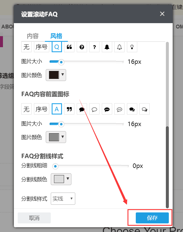 设置好滚动FAQ组件的内容和风格后,单击设置框右下方的“保存”按钮,以保存所设置的内容。
