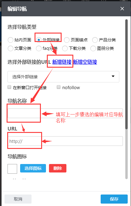 三、进入后选择“外部链接”后并点击“新增链接”,填写导航名称和URL,此处导航名称填写前面选的“关于我们”即可,URL填写:javascript:;然后保存,回到编辑页再保存一次并发布看前台效果。