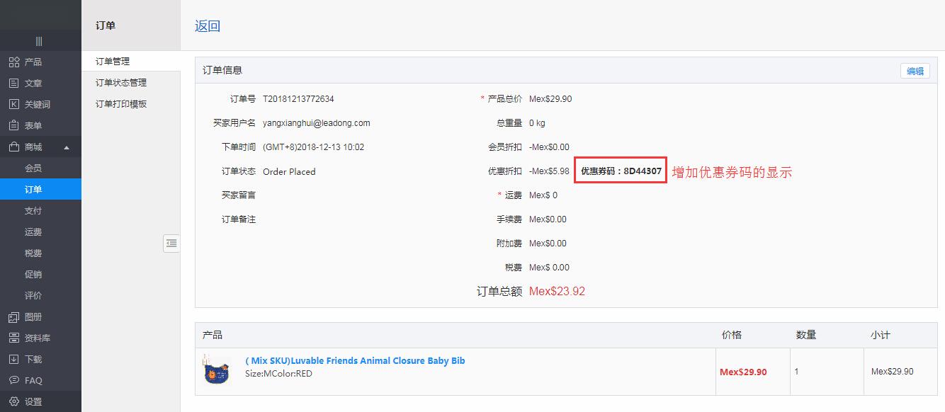 【应用效果】后台订单系统能够显示前台使用的优惠券码的应用效果如下截图所示: