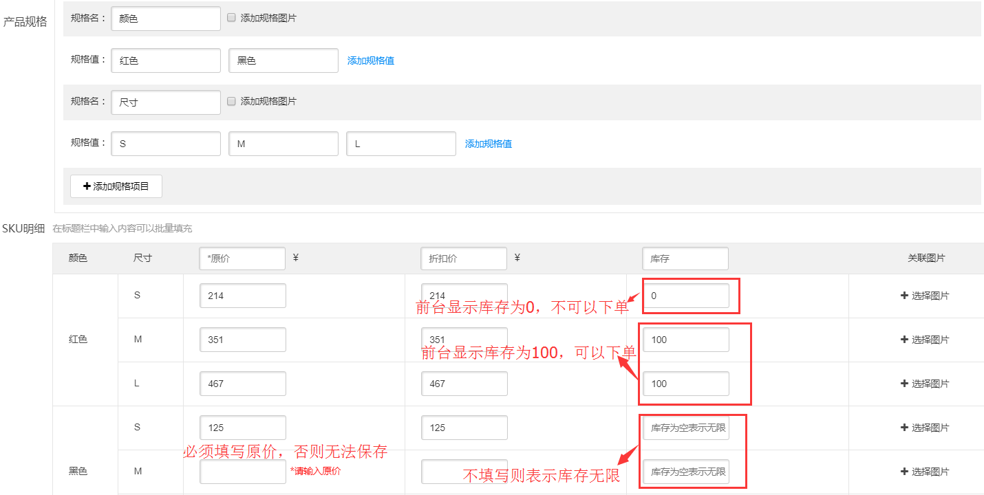 优化商城SKU功能,保存SKU的时候原价必须填写,库存为空时表示数量无限;