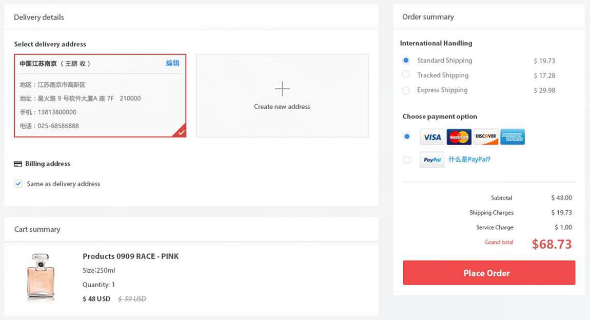 支持免登录购买,当然也推荐会员购买,可以按照不同的会员等级享受不同的折扣,一页式的结账页面,让整个购物流程简洁、清晰,提高转化率。