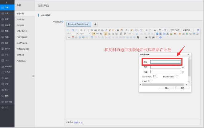 第二步:进入产品管理--编辑产品界面--编辑产品描述点击插入Iframe的小标志添加获取的视频代码来源链接,最后记得点击绿色保存按钮哦!
