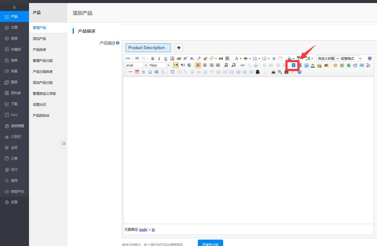 第二步:进入产品管理--编辑产品界面--编辑产品描述点击视频库小标志添加需要展示的视频,最后记得点击绿色保存按钮哦!