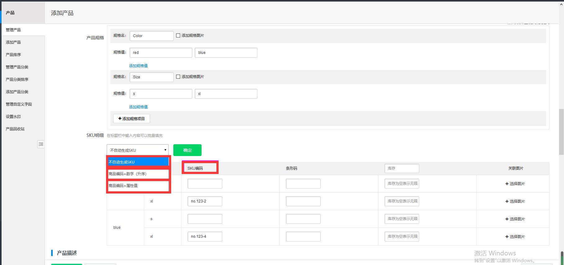 首先您需要通过内容管理--产品管理进入某个产品编辑的界面,之后设置SKU信息,在SKU明细中查看到SKU编码的设置入口,您可根据自己的需要选择生成SKU的方式,有“按商品编码+数字(升序)”、“商品编码+属性值”两种方式,当然您也可以选择不自动生成SKU的选项来自定义SKU编码。如下图: