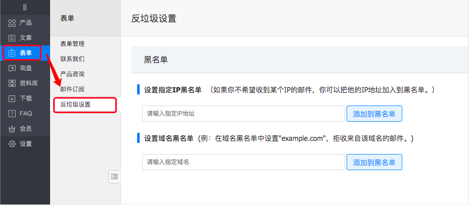 【操作指导】进入“内容管理”后台,在“表单”下的“反垃圾设置”中,输入IP/域名,点击“添加到黑名单”,即可将此IP/域名加入到黑名单,拒收此IP/域名发送的信息,操作如下图所示: