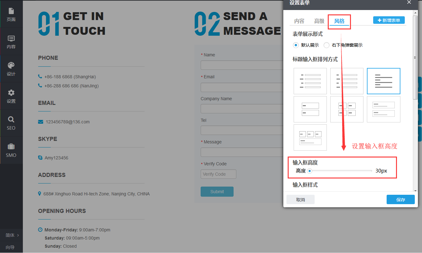 在弹出的设置在线表单窗口,可以设置表单的内容、高级,风格。
