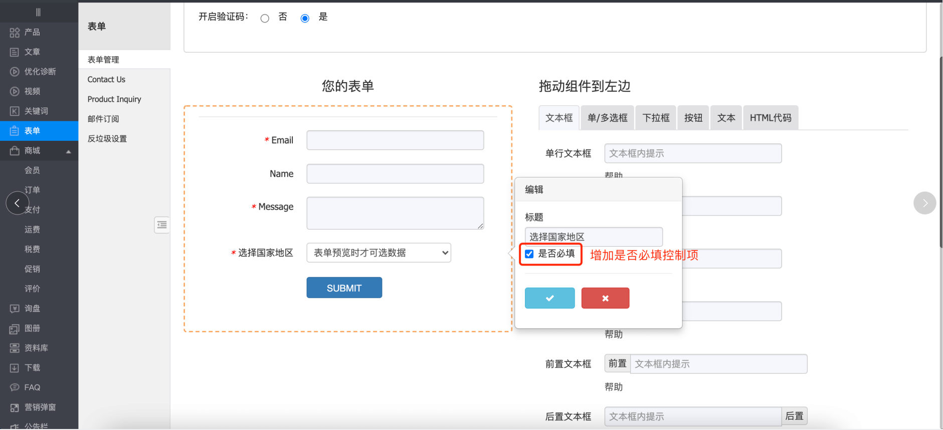 8、新增“国家”选择控件增加“是否必填”设置项。效果如下: