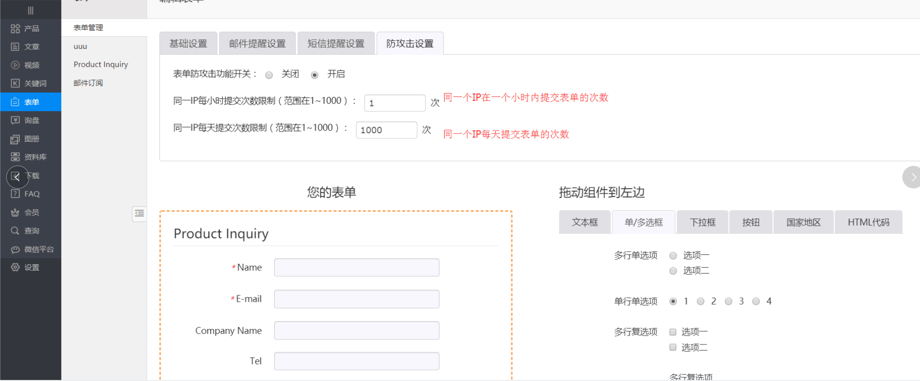 【应用效果】为了更好地满足客户关于表单的多样化需求,支点将表单防攻击逻辑进行了以下优化:(1)表单防攻击功能关闭表示同一个用户在前台可以无限次提交表单(2)表单防攻击功能开启,可以设置同一IP每小时提交次数限制(范围在1-1000),设置同一IP每天提交次数限制(范围在1~1000)。用这种方式控制表单提交次数,防止恶意攻击。具体效果如下截图所示: