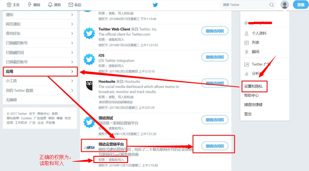 A:出现这种情况很有可能是因为在社交助手中绑定推特(twitter)帐号时没有授权给支点“写入”的权限,按照下图操作步骤先看一下有没有“写入”的权限,如果没有,请先单击“撤销访问权”按钮撤销访问权,然后再重新绑定一下推特(twitter)账号试一下。