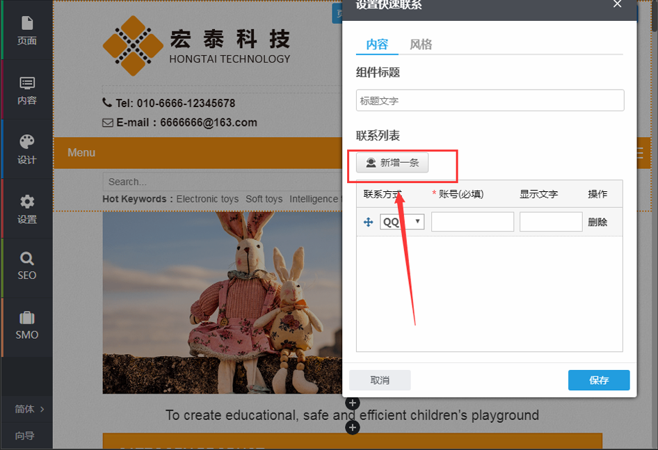 (2)在快速联系组件点击左上角的设置按钮-内容-新增一条。