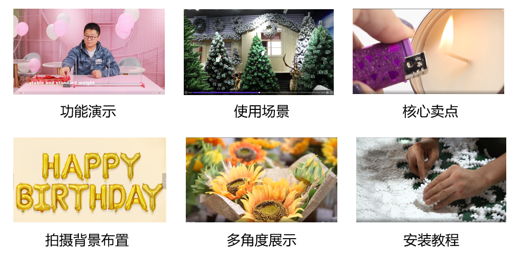 布置合适的产品应用场景,如圣诞节工艺品的应用场景需有圣诞氛围、生日礼品需要有生日元素等,诸如此类体现产品的整体效果。