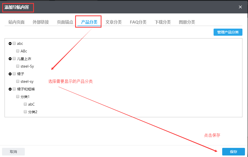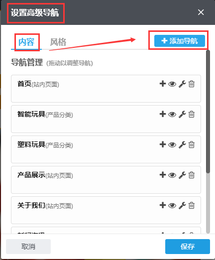 操作入口:编辑网站->高级导航设置->添加导航->产品分类->保存;