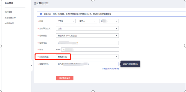 3、按提示填写信息,然后单击“验证备案类型”,具体见下图。注意:云服务类型选择备案授权码