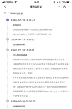 8、等待审核,备案初审:备案信息提交后,备案专员将在1-2个工作日内进行初审,并以短信及邮件形式通知审核结果.
