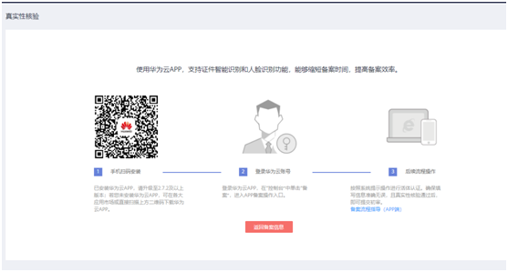 6、扫描上传资料页面中的二维码,下载并安装华为云APP。如果已经安装华为云APP,登录APP之后依次选择“控制台 > 网站备案 > 继续备案”。根据界面提示,上传资料。注意:必须下载华为云app进行真实性核验(必须本人操作)