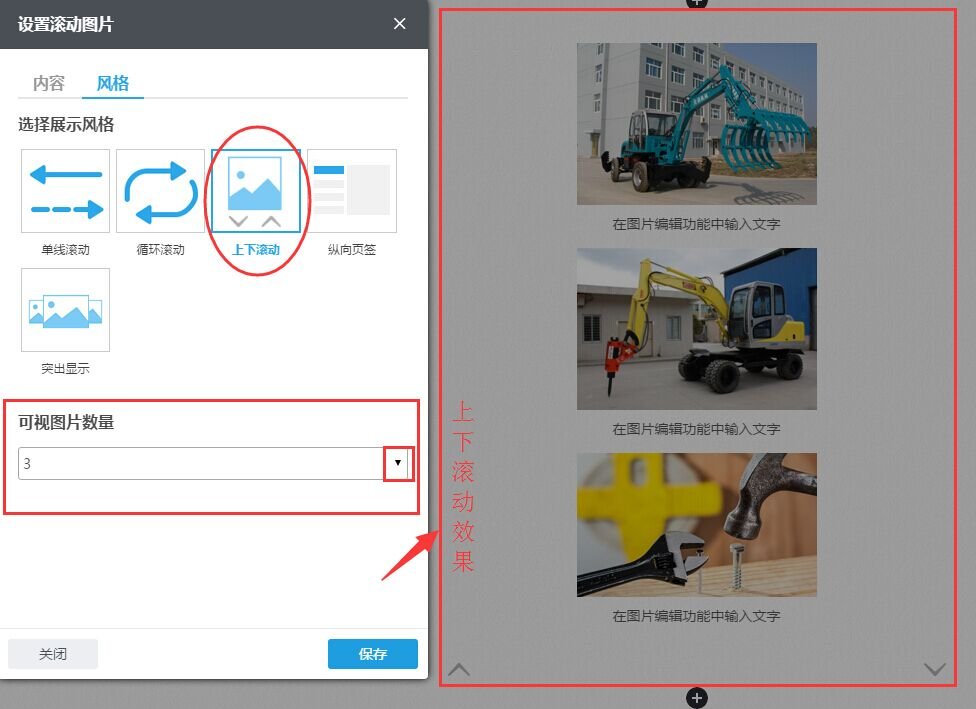 选择展示风格:支持单线滚动、循环滚动、上下滚动、纵向页签、突出显示等多种展示风格,详细情况如下: