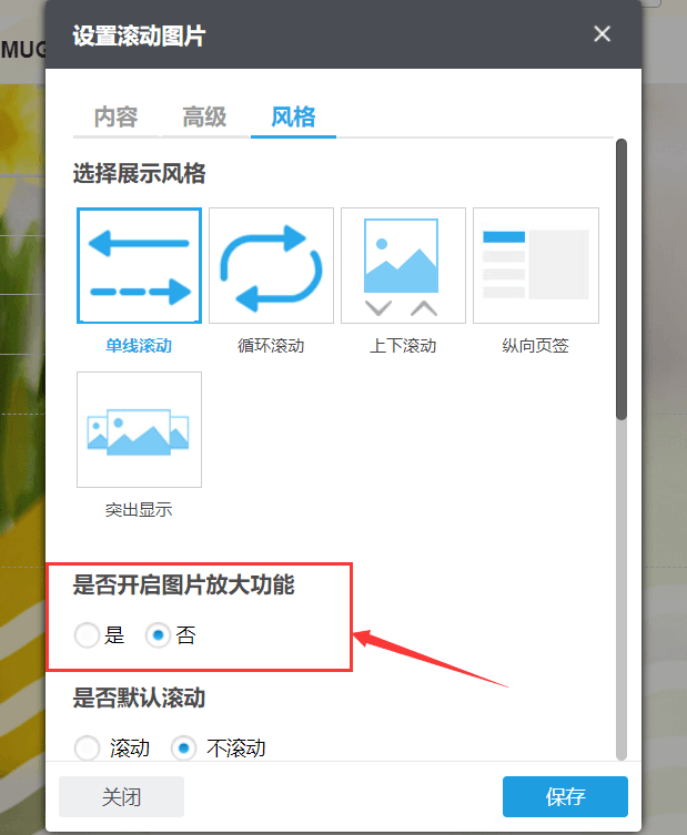 (1)新增功能应用场景:在滚动图片组件风格设置中勾选了风格1或者风格2时,可对是否开启图片放大功能进行设置,勾选“是”即可在前台浏览时点击放大图片进行查看,非常方便