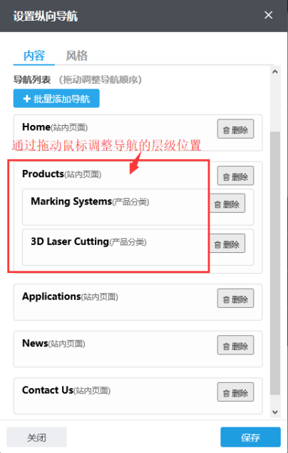 拖动创建导航层级:最多支持创建三级导航,把鼠标左键放到要创建层级的导航上,然后用鼠标左键按住这个导航拖动到要放置的位置,这个位置出现黄色区块松手,保存就可以;