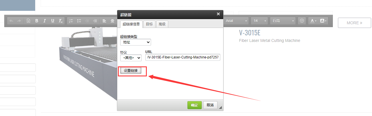 若后台上传产品为自定义URL,则步骤一和步骤二不变,步骤三改为点击外部链接,输入需要跳转的链接,点击保存即可