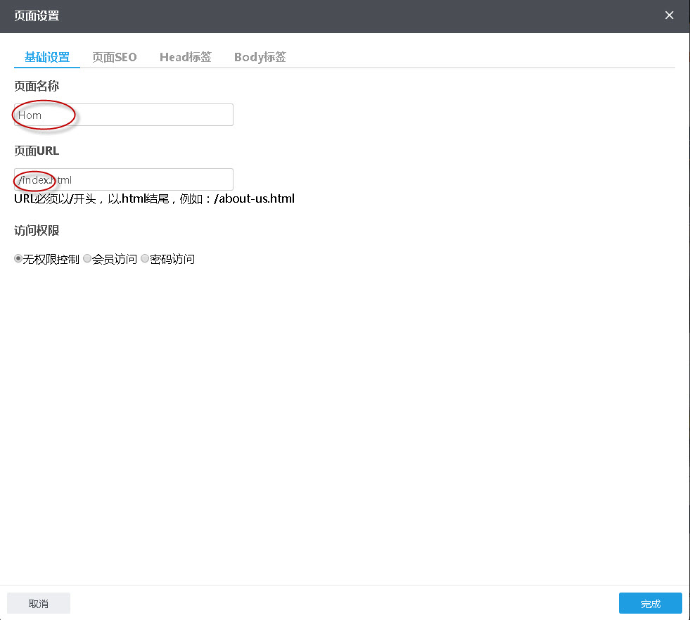 2、首次创建页面时,页面URL根据页面名称自动生成。以后对页面名称修改时,页面URL不会根据页面名称自动生成,但可以手动修改页面URL。对后台不熟悉的用户可能只修改了页面名称而没有修改页面URL,就会造成“页面URL与页面名称不一致,但却不知道原因“的情况发生。