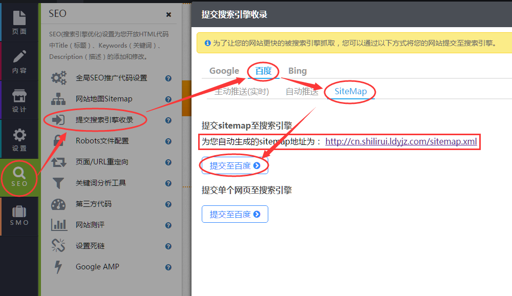 操作步骤:登录网站后台--》进入"编辑网站“--》单击“SEO”--》“提交搜索引擎收录”--》“百度”--》“SiteMap”--》单击“提交至百度”;