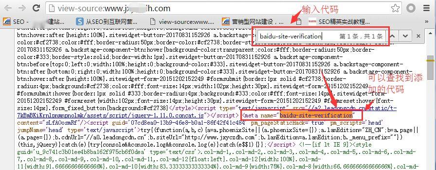 这里介绍一种常用方法:需要先打开网站(任何一个页面都可以),然后用快捷键Ctrl+U打开页面源码,然后用快捷键Ctrl+F打开搜索框,在搜索框输入验证代码关键词,例如baidu-site-verification,看能否找到百度验证码,若能找到就可以进行下一步了,如果不能找到,可以再等几分钟查看或者重新发布,直接确认验证代码添加成功再进行下一步;