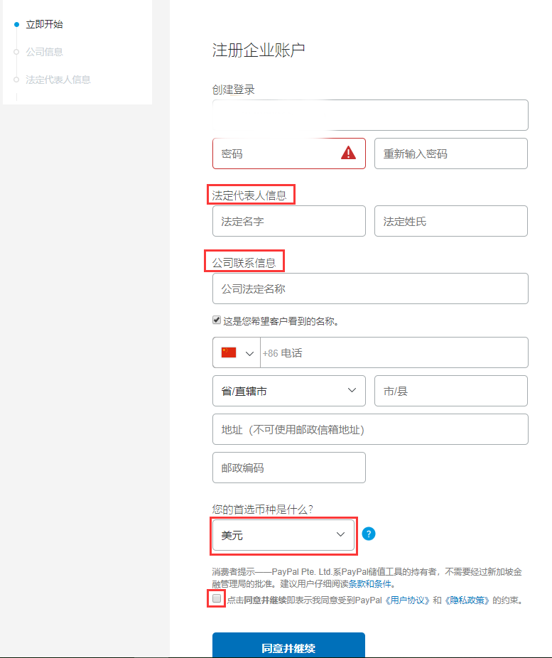 5.开始填写企业注册信息,包括邮箱号、创建新密码、法人信息、公司信息、首选币种等,此页面信息填写完点击“同意并继续”按钮进入到下一步,如下图:
