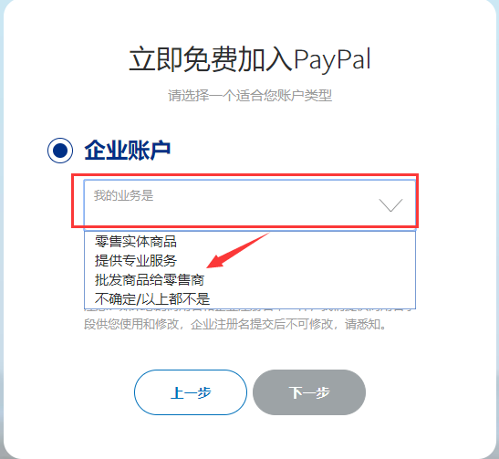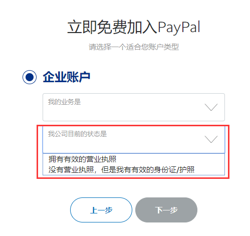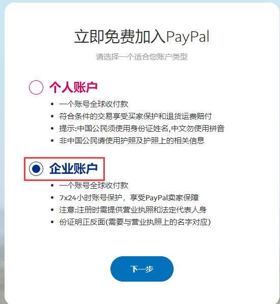 2. 开始注册PayPal,根据情况可选个人账户或企业账户进行注册,如图所示: