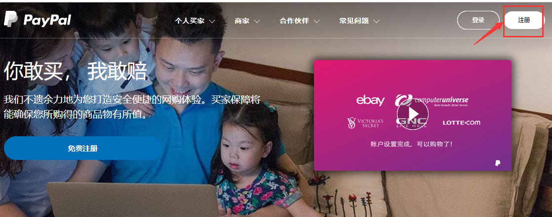 1. 打开PayPal官网在网站右上角点击注册,开始注册PayPal账号,如图所示: