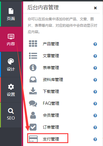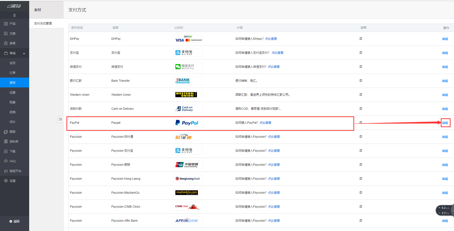 1.PayPal注册完成,开始绑定您在支点的网站后台,登录网站后台进入到编辑页面,点击“内容”选择“支付管理”绑定PayPal;