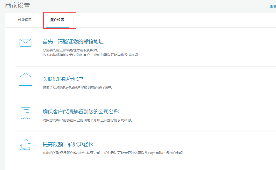 12. 选账户设置,验证邮箱、关联银行账户以便从PayPal提取款项,公司名称填写清楚确保客户可见等;