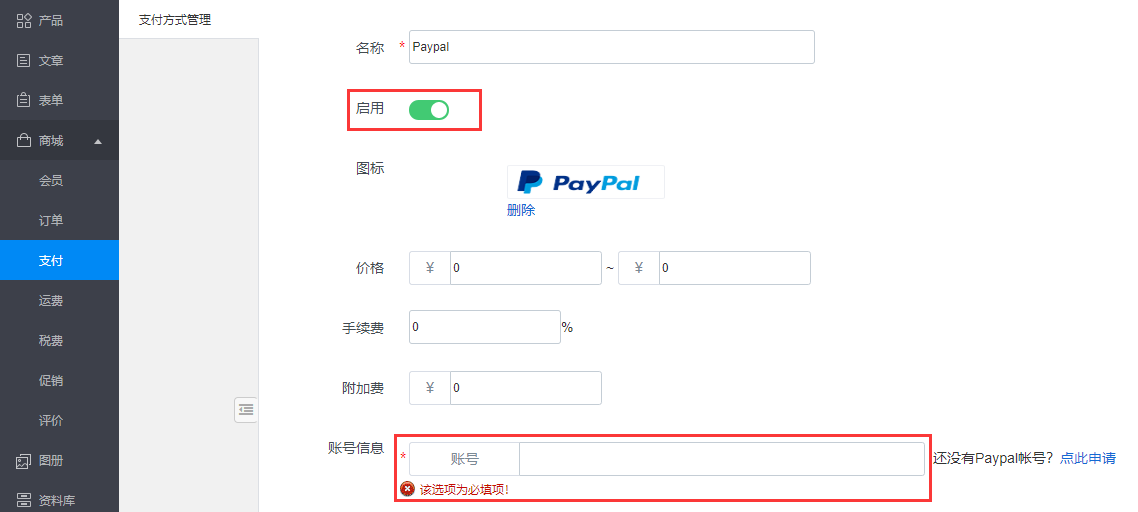 3.设置PayPal,点“启用”按钮,并把之前注册好的PayPal账号填写到“账号信息”编辑框内,价格区间、手续费、附加费可根据实际情况进行填写,最后点击保存即可。