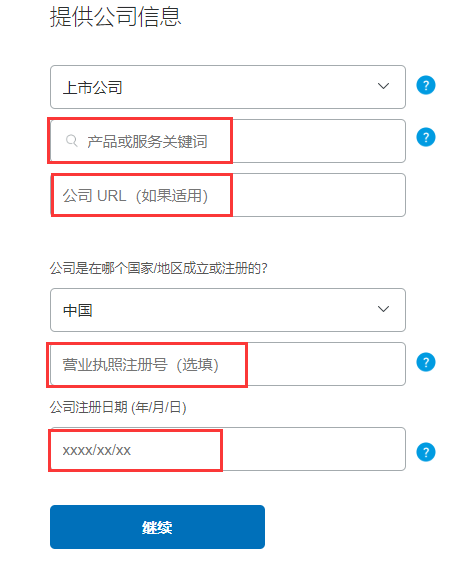 7.公司类型选择后会出现对应的公司类型信息填写界面,如上市公司、私营公司和合伙经营填写的信息是相同的,比如以上市公司为例,需要填写产品或服务关键词、公司URL以及营业执照注册号和注册日期,填写完点继续进入到下一步。