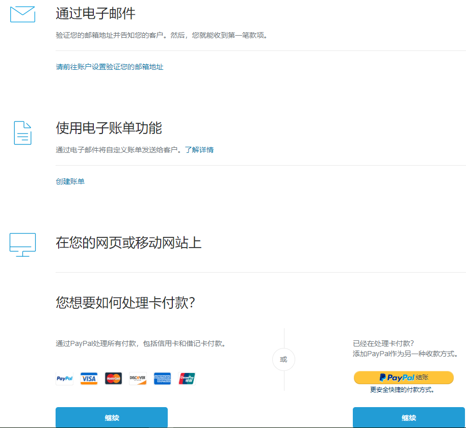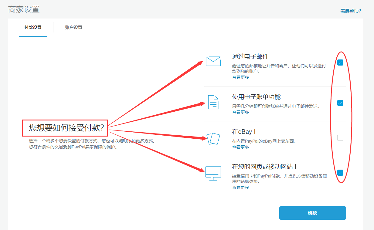 10. 进行商家设置里的付款设置,选择接受付款的方式,有如下图所示四种付款方式可选,可多选,勾选完点击“继续”按钮进入到下一步;