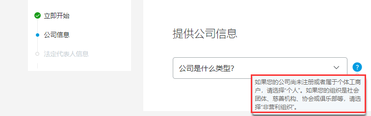 6.进入到选择公司类型页面,如果您的公司是尚未注册或者属于个体工商户,选择“个人”,如果您的组织是社会团体、慈善机构、协会或俱乐部,请选择非营利性组织,其他类型根据实际情况进行选择即可。