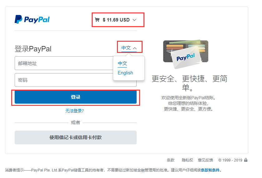 5.跳到Paypal支付界面后需要输入付款方的paypal账号和密码登录,选择登录界面语种后,输入好对应信息后点击【Log In或登录】按钮;