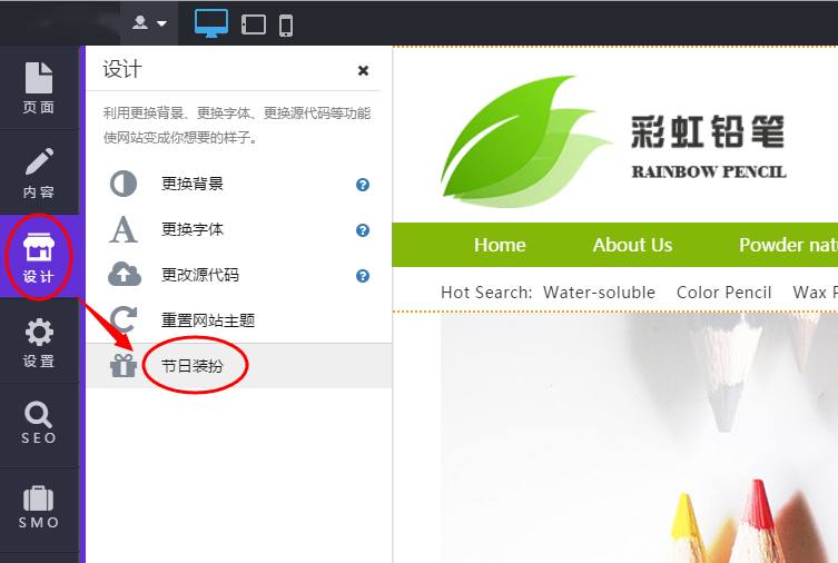 第2步:点击左侧“设计”模块的“节日装扮”进入;